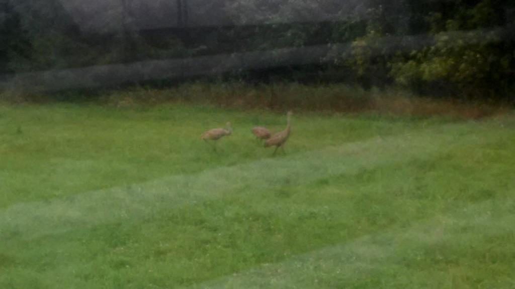 And finally, we have three sandhill cranes hanging around the farm. They don’t let us get close enough to get a good picture but are fun to watch from a distance. I think they are just passing through on their way south, stopping at the farm for a snack.