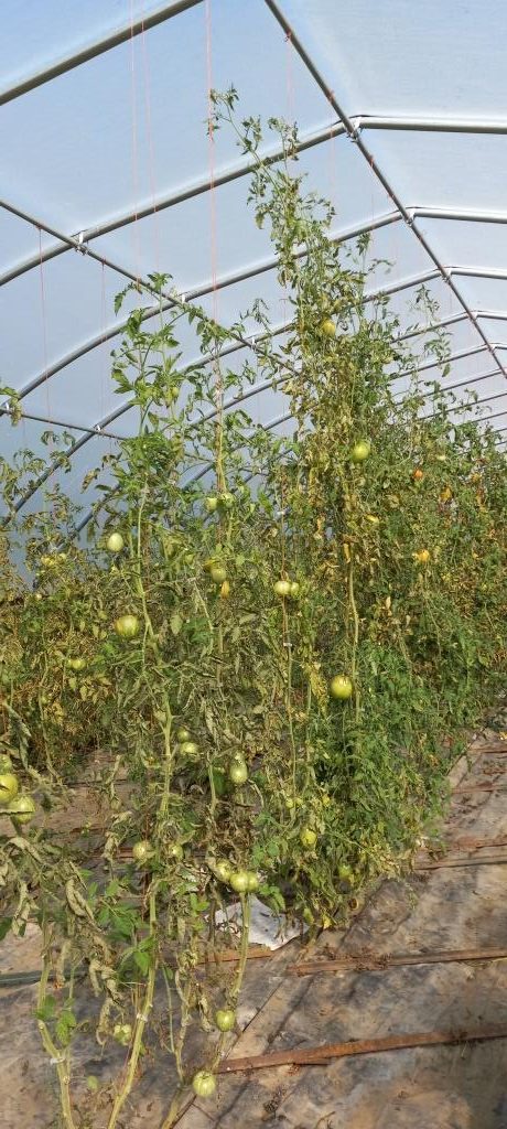 As farming seasons go, I have to believe this is the most atypical one so far. In a typical year we have frost sometime in the month of September. If the current weather forecast holds true we won’t have a frost this month. Which is a good thing. Without a frost our warm season crops continue to grow, not as fast as in the summer due to the lack of sunlight but still quite a bonus! For example, the tomato plants in the hoop house are reaching the top of the structure! That’s about 16 feet tall!