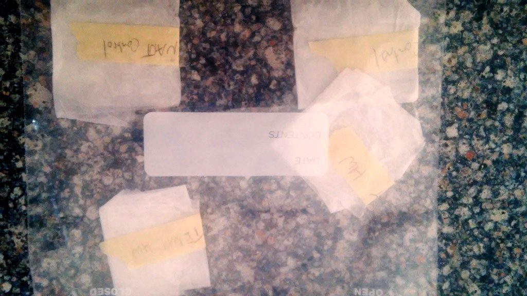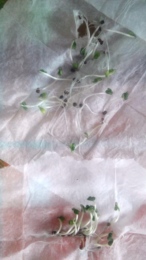After leaving the germination chamber in our climate controlled laboratory (my wife calls it a kitchen) for a few days I took a look and viola we have germinated seeds in both the experimental group and the control group. Who’s calling it just a ziplock bag with a wet towel inside now?