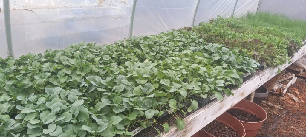 Other than waiting for the right weather for plastic installation we are still planting in the greenhouse. We have started transitioning some crops into our cold frame. This is an unheated structure we use to acclimate plants to the more harsh conditions found out in the real world. It’s kind of like college for plants. Sure you are now “living on your own” but you still have people supporting you.
