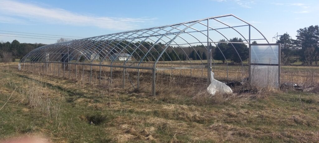 One project we will undertake soon is the installation of the replacement plastic on our hoop house. Two years ago we had a bad storm with high winds that tore open our hoop house. We were planning on replacing the plastic last season but something must have come up. This year we have the plastic we just need to find a time to replace it. The most important factor regarding plastic installation is that we need a wind-free and rain-free day (snow-free too I suppose). The sheet of plastic we put on is 100 feet by 42 feet. That is quite the sail! Any small breeze can be problematic. We have installation scheduled for Monday morning April 20th. If anyone wants to lend a hand please let me know. We have tasks for ground based workers as well as aerial workers. If the weather isn’t cooperative that day we will reschedule to the next, then the next, then the next until we finally get a day that works. And most importantly, the installation of the plastic will give us something to talk about in a future newsletter.