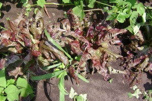 We don’t tell the customer about the almost three inches of rain that fell in about 45 minutes followed by winds gusting over 50 mph causing the sweet corn to lie flat on the ground. We don’t mention the hail that tears through the lettuce leaves leaving them in shards. We don’t discuss the recently planted bean seeds that ended up floating on the new temporary pond – courtesy of the three inches of rain.
