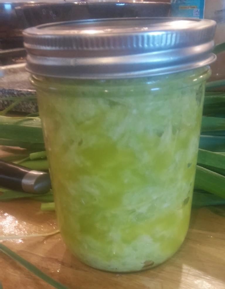 We used about a dozen stalks of green garlic to make a shredded garlic paste. We washed them then cut off the yellow leaves and roots. We separated the lower stalks from the upper leaves. We put the lower parts in a food processor and tried to grind them into pieces. It actually shredded them more than ground them. We added some oil until it turned into a paste. We then put it into a pint jar and into the fridge to be used whenever we need to add garlic flavor to a dish.
