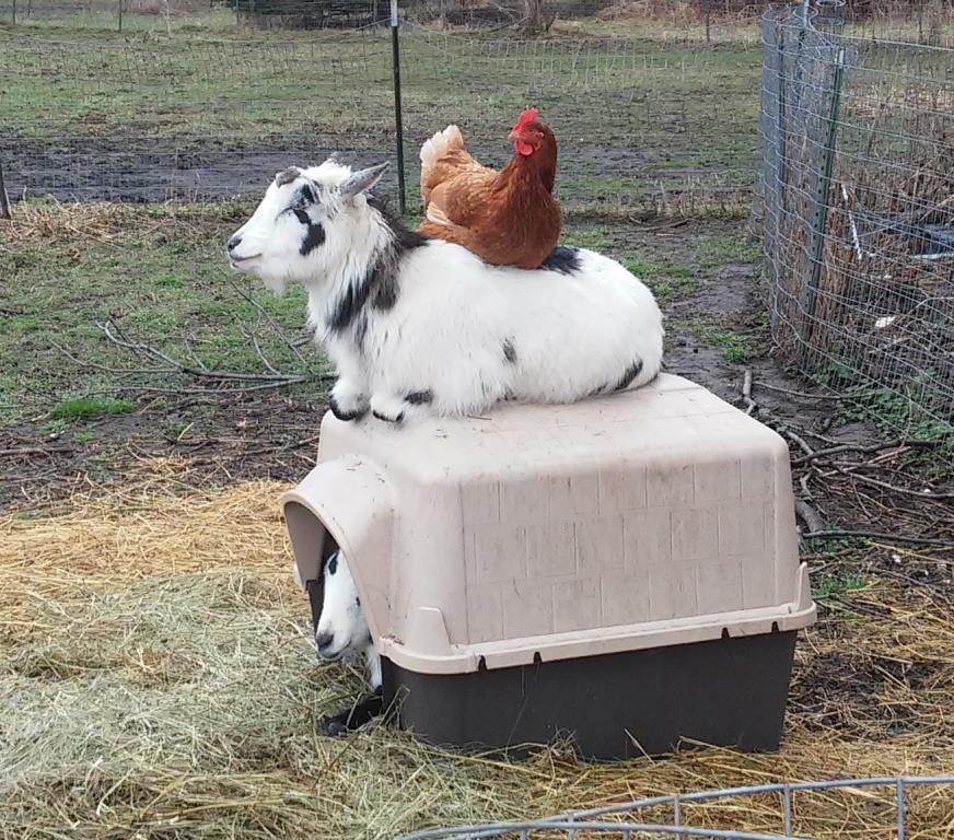 chicken on a goatHappy St. Urho’s Day (a little late but whatever)!  In honor of St. Urho I give you this picture of a chicken sitting on a goat sitting on a dog crate with another goat inside.  I’m not sure why it would honor St. Urho but it was a picture that had to be shared and today is the perfect day for sharing it.  Oh, and Happy St. Patrick’s Day for our Irish readers.