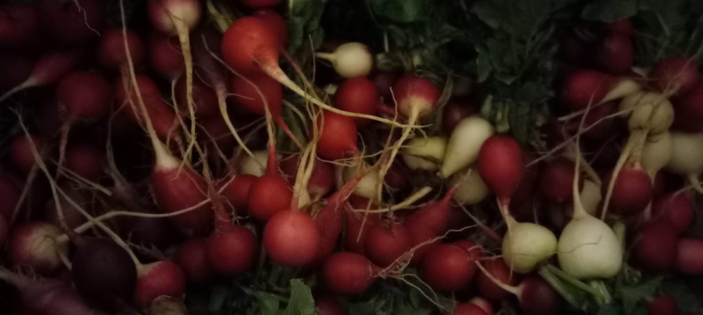 Finally, I want to mention before I forget that the radish tops do not look appetizing and you should just cut them off and use the roots. The tops have been through a number of frosts/freezes and just couldn’t survive the ordeal. But they aren’t bunchable without the tops so we leave them on for bunching purposes. Which brings up another point: Whenever you receive root veggies that have their tops on you should remove the tops soon after receiving them. The tops continue to transpire which draws water out of the root and causes the root to dehydrate faster. So store your root veggies topless!