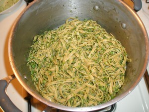 Note: the heat from the pasta and pan should heat the pesto without turning the stove back on.