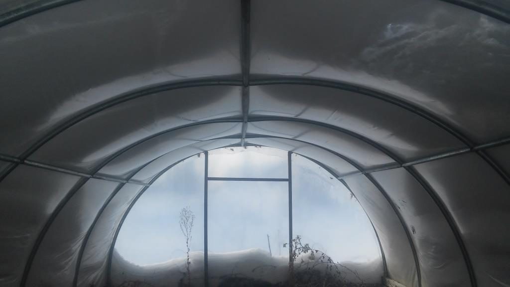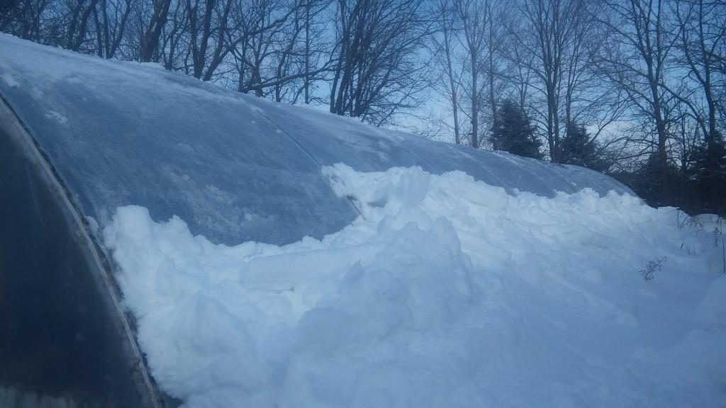The hoop house is in far worse shape. Here is a picture from the inside. I tried pushing the snow off from inside the hoop house but it had no where to go. Since it is an unheated structure we have no way to melt off the snow easily so for now we just hope it can hold the weight of the current snow and that we don’t get any more soon.