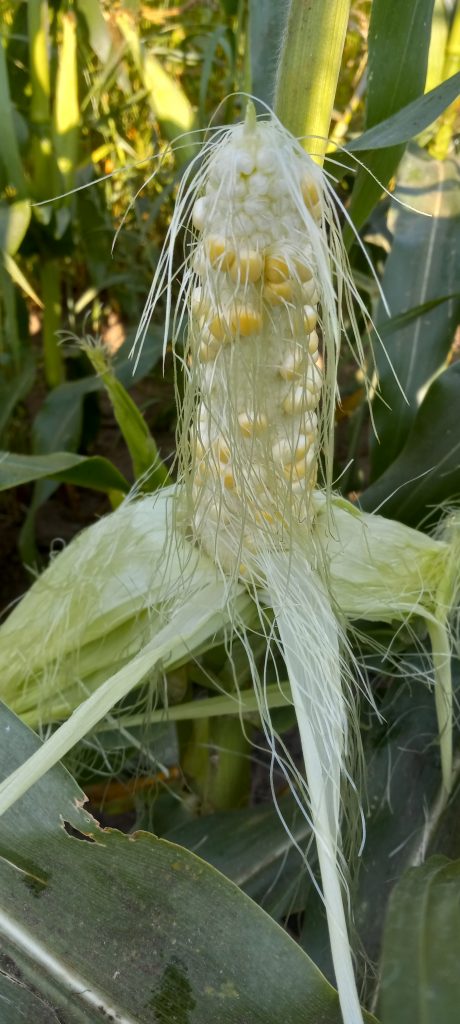 Another plant that seems to have trouble with pollination lately is this last planting of sweet corn. We’ve found quite a few ears where there are quite a few missing kernels. Typically we can feel through the husk and leave behind those ears which are not mostly formed but this latest planting seems to be a bit more vexing. The husks are thicker and seem to keep us from fulling comprehending what is going on beneath the husk. So sometimes you end up with ears of corn with missing kernels or missing rows of kernels. With the corn the pollination problem seems to be due more to late silking of some of the stalks. The tassels have already shed their pollen before the silk emerged. Or also likely, the pollen was washed away by a rainstorm before the silk emerged to be pollinated. Whatever the cause, it is certainly frustrating when again we farmed perfectly but nature threw us a curve ball and affected the pollination.