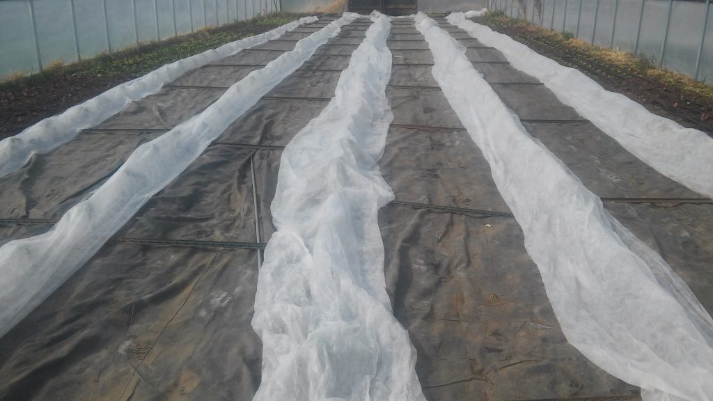 Anyway, for the most part the farm has escaped harm caused by these cold temperatures. Other than the first planting of corn, we have not transplanted any warm season vegetables out in the field. We did transplant the tomatoes into the hoop house but we took precautions and covered them with not one but two layers of row covers. Why two layers? Because the row cover was wide enough to fold in half lengthwise, no other reason. The tomatoes have survived. They aren’t growing very fast but they are still alive.