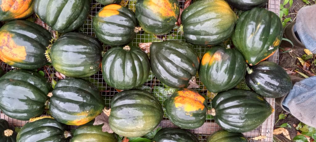 I am reminded of this at this time of year when storage space is at a premium. A lot of the fall crops are crops that we harvest all at once — or I should say would like to harvest all at once but without enough storage space (as well as labor and time) we end up spreading the harvesting over an extended period of time. One of the biggest space hogs are the winter squash and pie pumpkins. We’d prefer to harvest all of these at one time, store them in a dry location, then give them out over the course of many weeks. To accomplish this we use the only large covered space we have available this time of year — the greenhouse. And even it is not enough space to store all the squash and pumpkins.