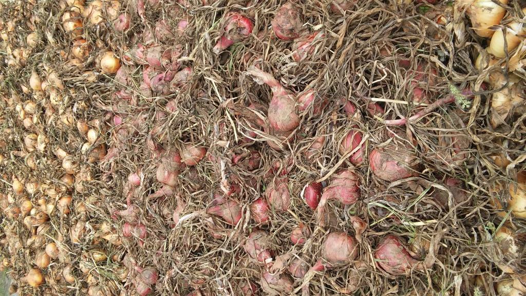 Anyway, topless farming is what we are doing here at the farm and it is hard to claim it is sexy. Over the last several weeks we’ve spent any free time or rain days cutting the tops off all the garlic bulbs we harvested and cured this past August. We would have preferred to be totally topless awhile ago but it just didn’t happen. But it is done now and allows us to move onto the next free time/rain day project which is another topless farming project — cutting the tops off the onions we harvested last month. After we harvested the onions we put them in the greenhouse to dry and cure. They are now ready to be topped. We got through about a quarter of them so far but of course still have a lot to go.