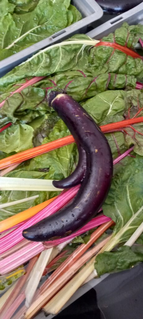 Zucchini! Some eggplants, cucumbers, green onions, some garlic scapes, some broccoli, some snap peas, some snow peas, some shelling peas, pickling cukes, some chard, maybe kale, lettuce and I suppose some other things I’m not recalling at the moment.